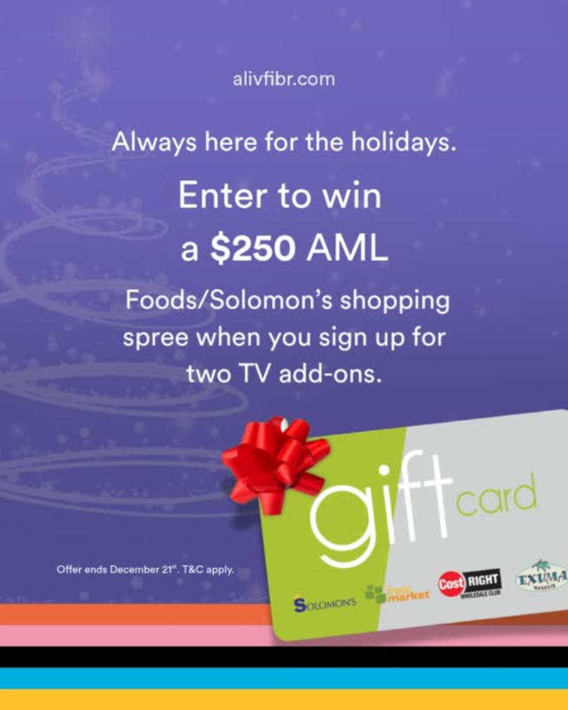 Sign up for any two TV add-ons and enter for a chance to win a $250 AML Foods/Solomon’s shopping spree. This offer is open to all ALIVFibr TV customers.